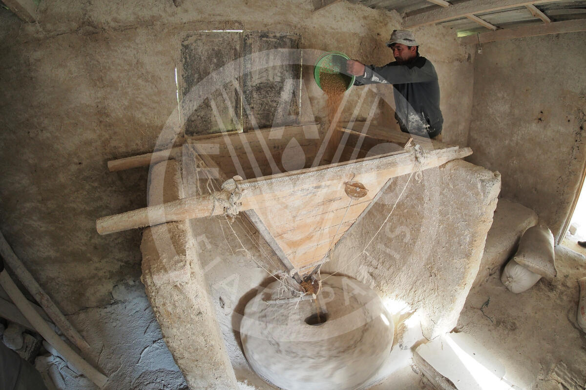 May 2025. Lolazor village Almosi Valley, Hisor. The owner of the water mill, Saidakhmad Dzhonmakhmadov, pours grain into the flour mill