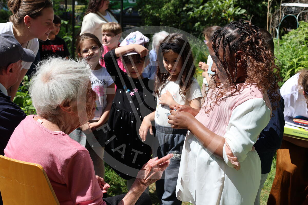 12 May 2025, Brussels, Belgium — The group of senior citizens from Stephenson Garden retirement home share tips and plant wisdom with the group of children from École de l'Héliport primary school. International Day of Plant Health Celebration in Brussels. La Ferme du Parc Maximilien.