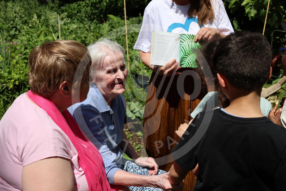 12 May 2025, Brussels, Belgium — The group of senior citizens from Stephenson Garden retirement home share tips and plant wisdom with the group of children from École de l'Héliport primary school. International Day of Plant Health Celebration in Brussels. La Ferme du Parc Maximilien.