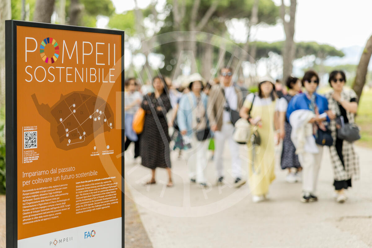 15 May 2025. Pompeii, Italy. Workers install totems in Pompeii site, built as part of the “Sustainable Pompeii” project, created by FAO in collaboration with the Archaeological Park of Pompeii and the Italian Ministry of Foreign Affairs and International Cooperation (MAECI).