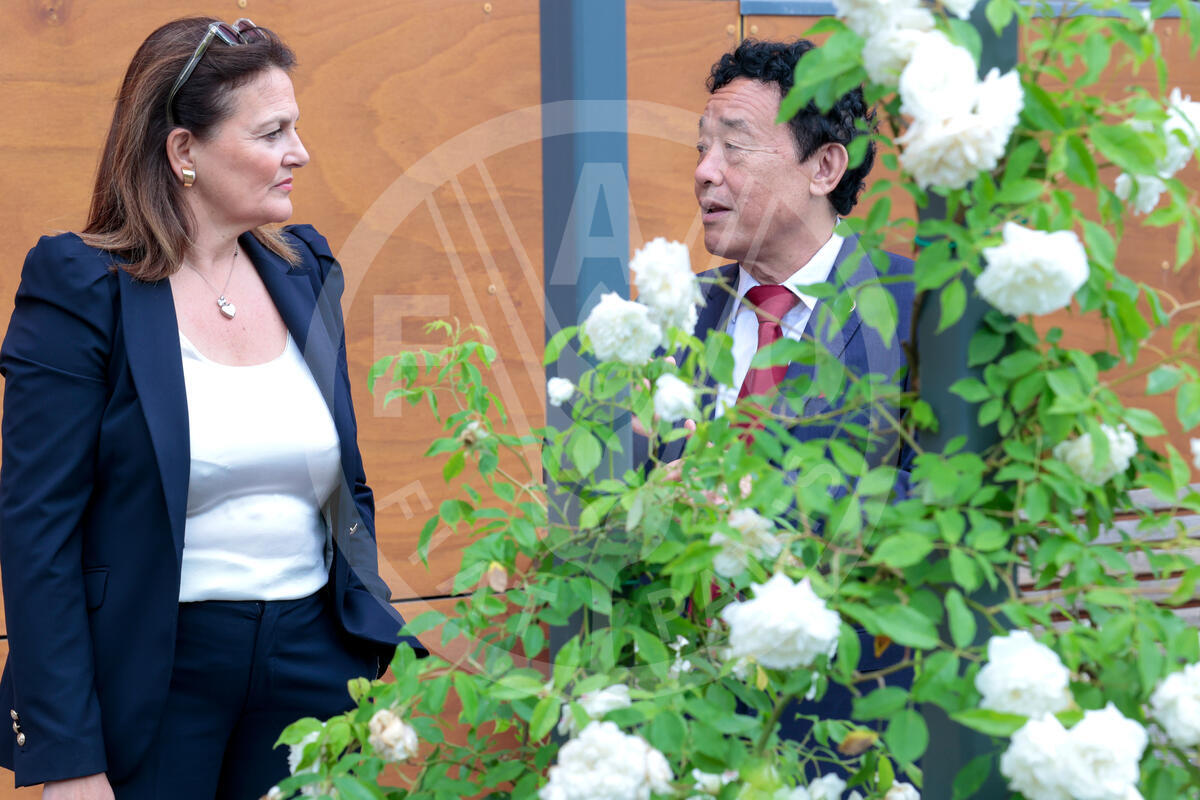 07 May 2025. Milan, Italy. QU Dongyu, FAO Director-General talks to Francesca Colombo, director of BAM, Biblioteca degli Alberi during his visit to the new roses garden, part of the green urban space.