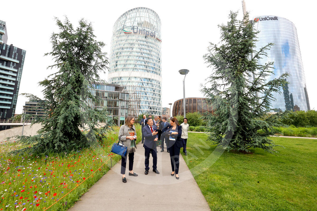 07 May 2025. Milan, Italy. QU Dongyu, FAO Director-General (C), next to Anna Scavuzzo, deputy mayor of Milan, (L) talks to Francesca Colombo, director of BAM, Biblioteca degli Alberi, during his visit to the green urban space.
