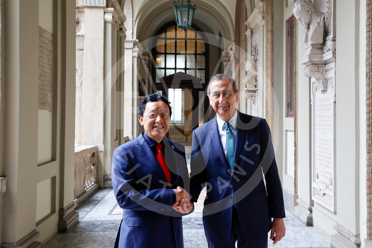 06 May 2025. Milan, Italy. QU Dongyu, FAO Director-General (L) shakes hands with Giuseppe Sala, Mayor of Milan at the end of their bilateral meeting with at Milan’s Palazzo Marino.