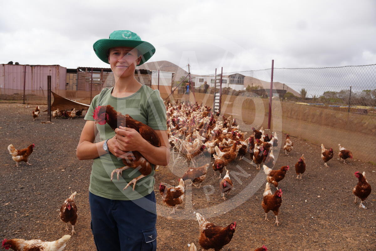 23 April 2025. Lanzarote Island, Spain. MarÃa Guerra holds one of the 400 hens she is currently raising. MarÃa runs a traditional farm in Lanzarote, where she practices organic and sustainable agriculture.