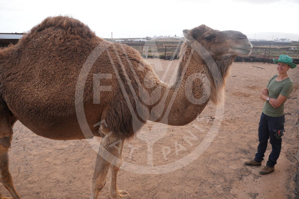 23 April 2025. Lanzarote Island, Spain.  Emma, the camel and beloved mascot of MarĂ­a Guerra’s farm in Tinajo, Lanzarote.