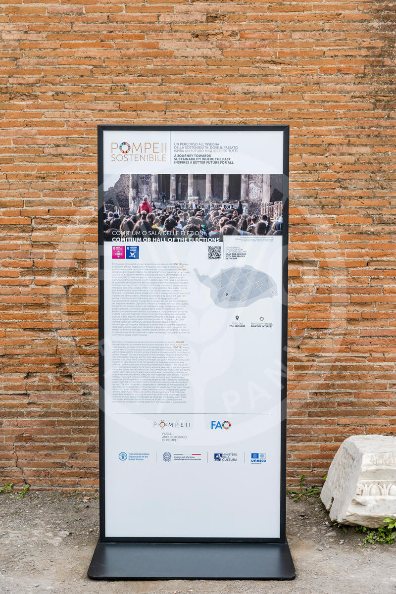 15 May 2025. Pompeii, Italy. Totem installed in Pompeii site, built as part of the “Sustainable Pompeii” project, created by FAO in collaboration with the Archaeological Park of Pompeii and the Italian Ministry of Foreign Affairs and International Cooperation (MAECI).