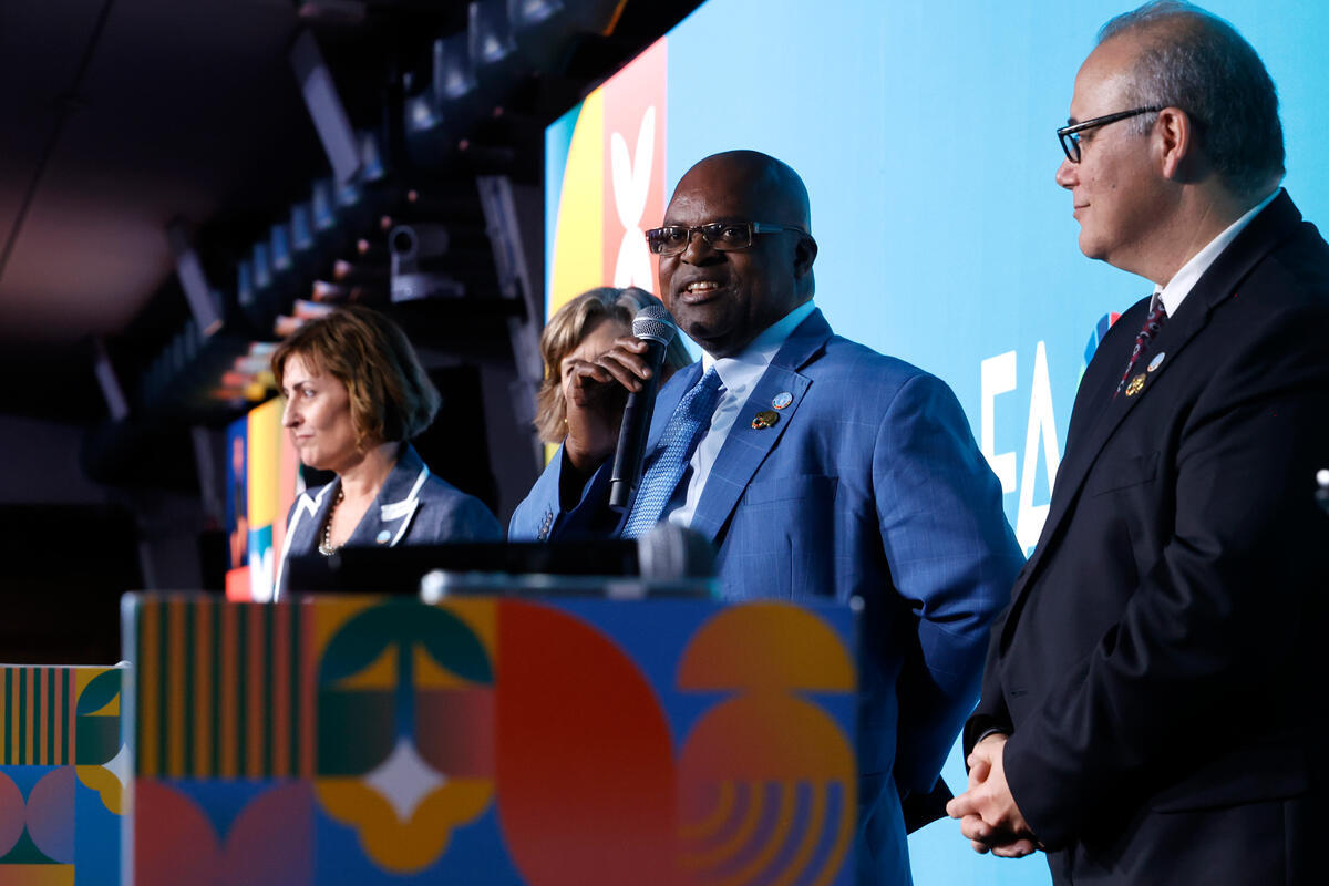 17 October 2025, Rome, Italy. Godfrey Magwenzi, FAO Deputy Director-General, delivers his address during the World Food Forum 2025 Closing Ceremony. The fifth edition of the World Food Forum (WFF), the largest annual gathering of agrifood systems stakeholders globally, runned at FAO headquarters in Rome from 10 to 17 October 2025. FAO Headquarters (Plenary Hall).