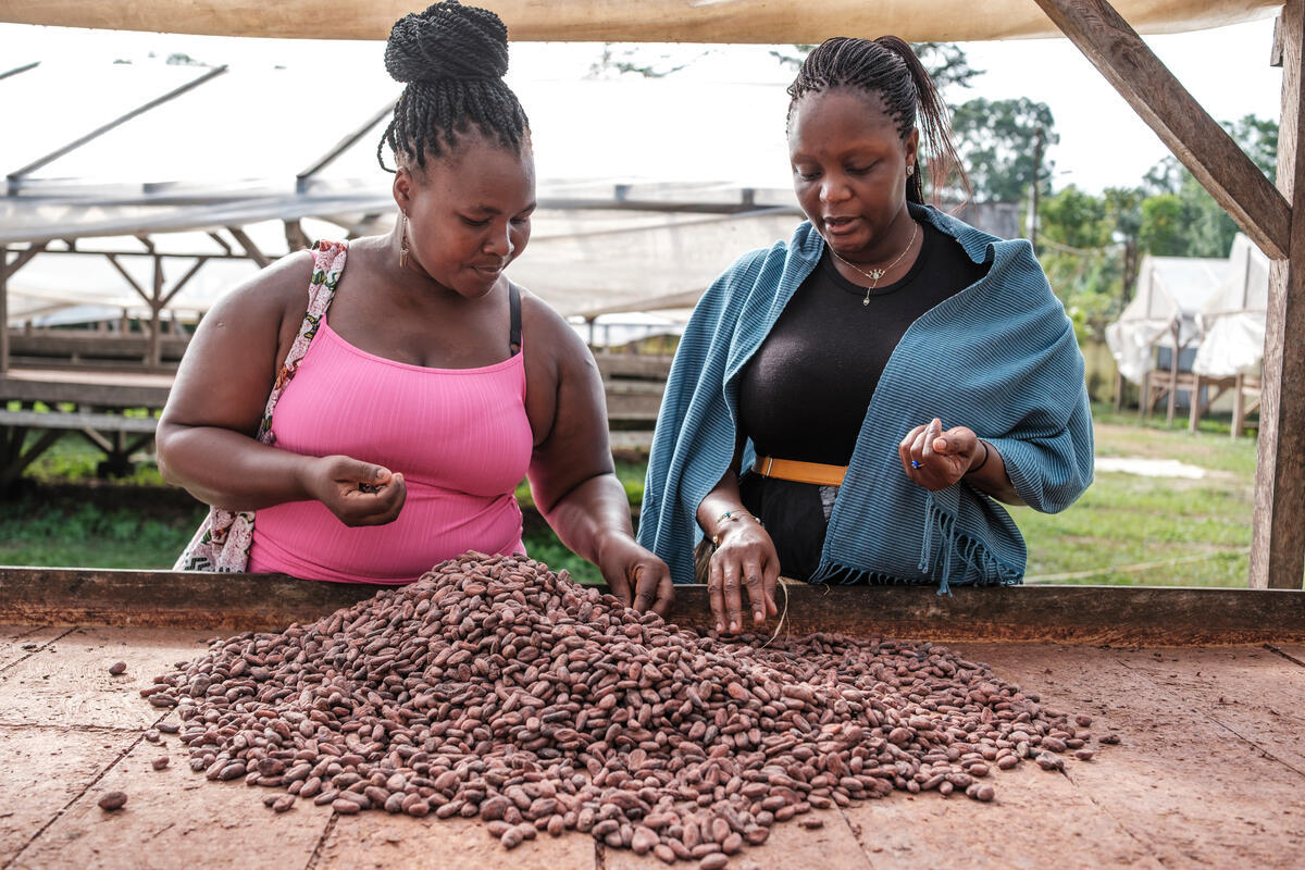 06 June 2025. Praia das Conchas, Sao Tome e Principe. Chef Binta (R) talks with Camila Varela De Carvalho, as they manipulate cocoa beans at the drying beds of the Organic Cocoa Production and Export Cooperative (CECAB).
