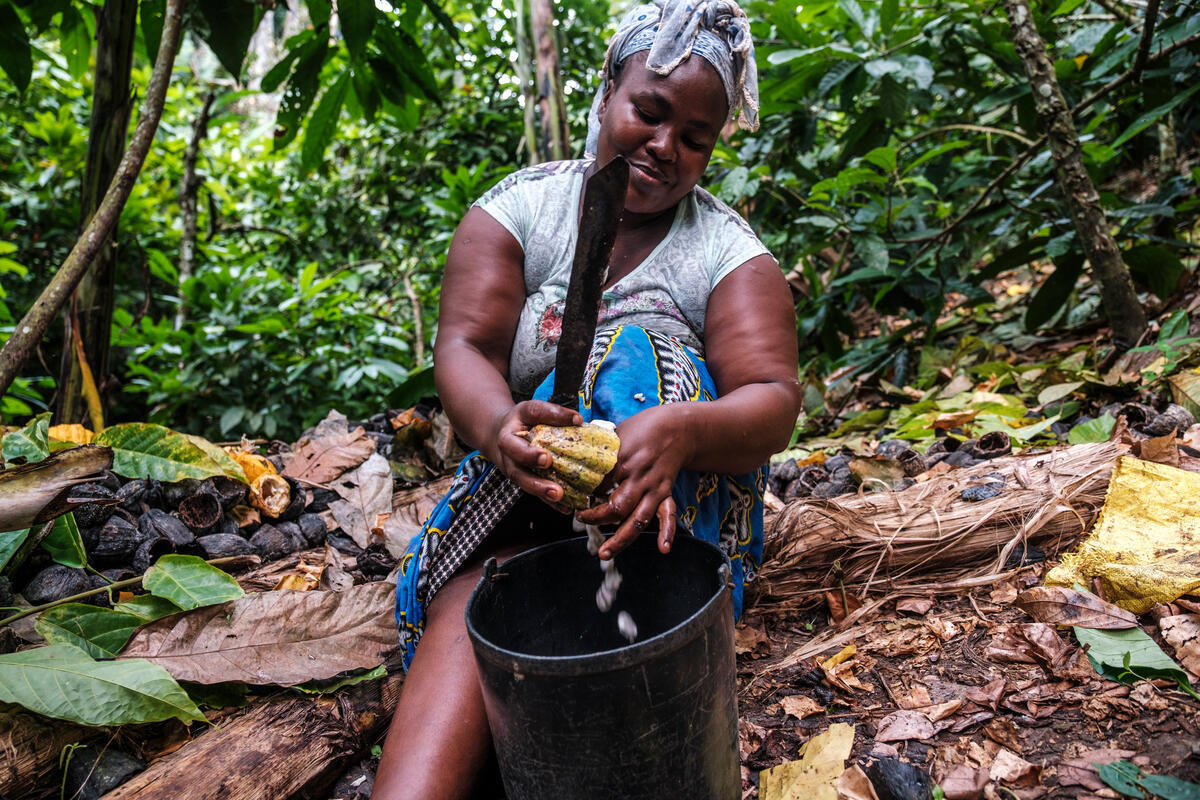 SAO TOME E PRINCIPE, 2025. Woman farmer with just-picked cocoa pods