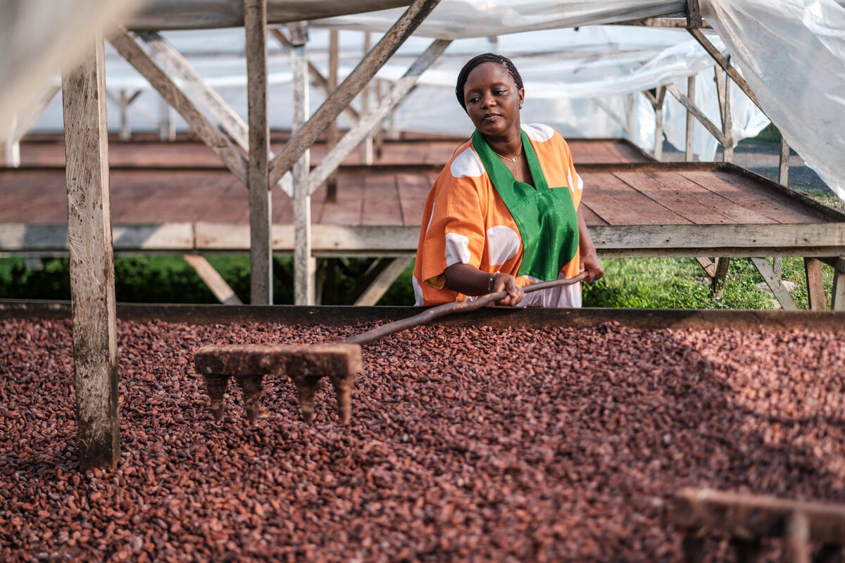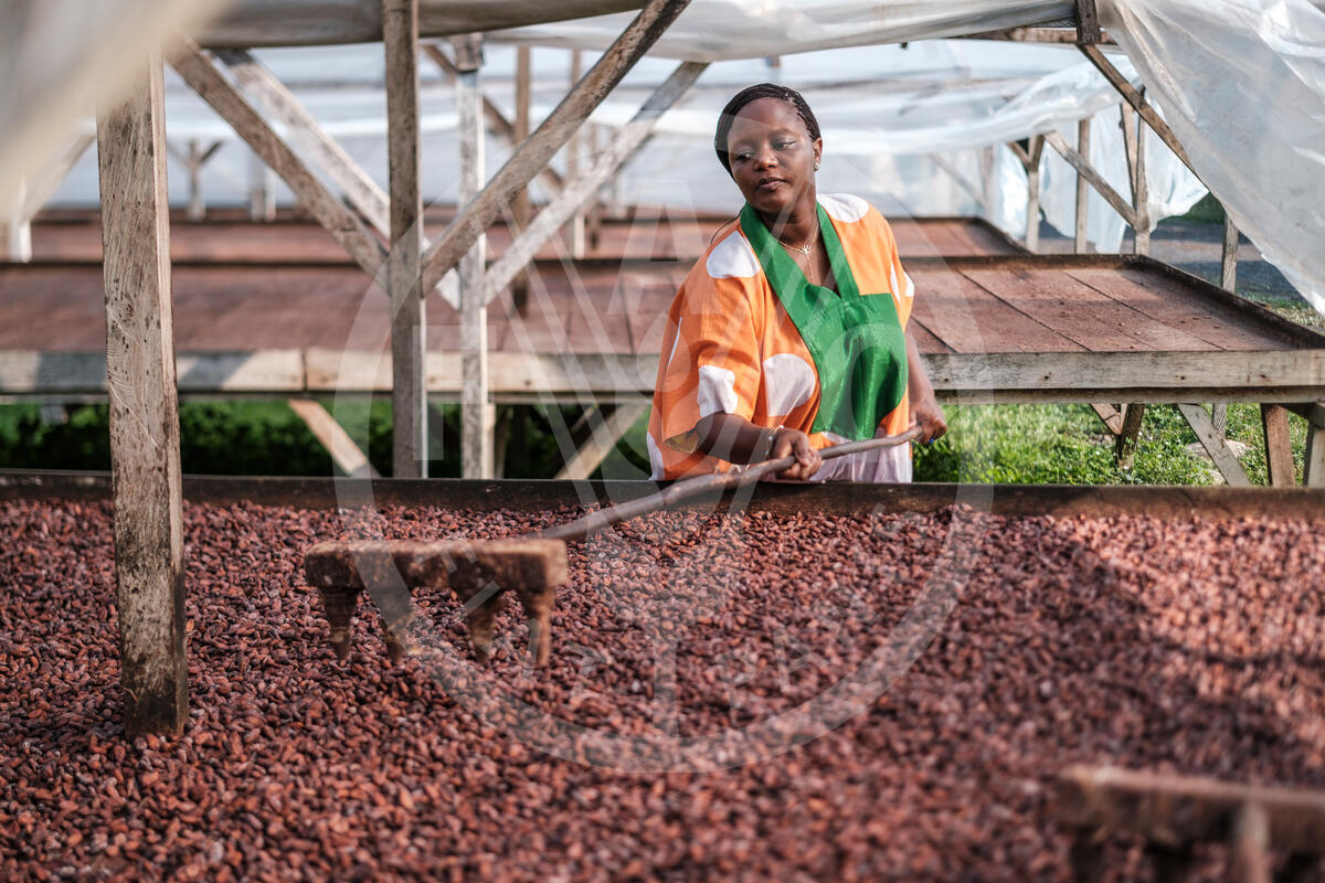 SAO TOME E PRINCIPE, 2025. Chef Binta spreads drying cocoa beans