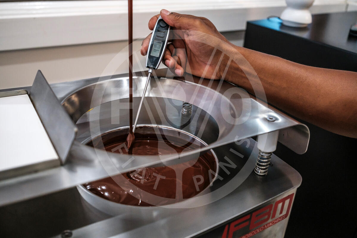 SAO TOME E PRINCIPE, 2025. Checking the temperature of melted chocolate