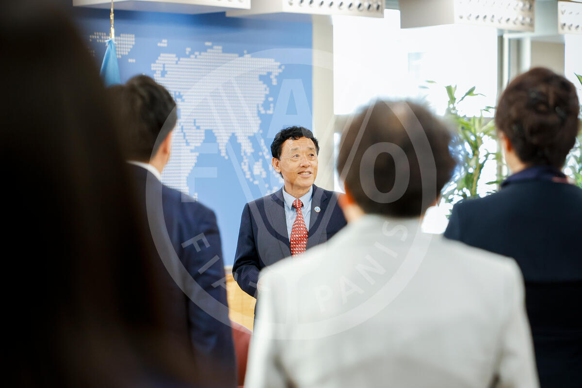 12 June 2025. Rome, Italy. FAO Director-General QU Dongyu speaks to the delegation from the Ocean University of China on the sidelines of the signing ceremony of a Memorandum of Understanding (MoU) between FAO and the Ocean University of China. FAO Headquarters (Iraq Room).