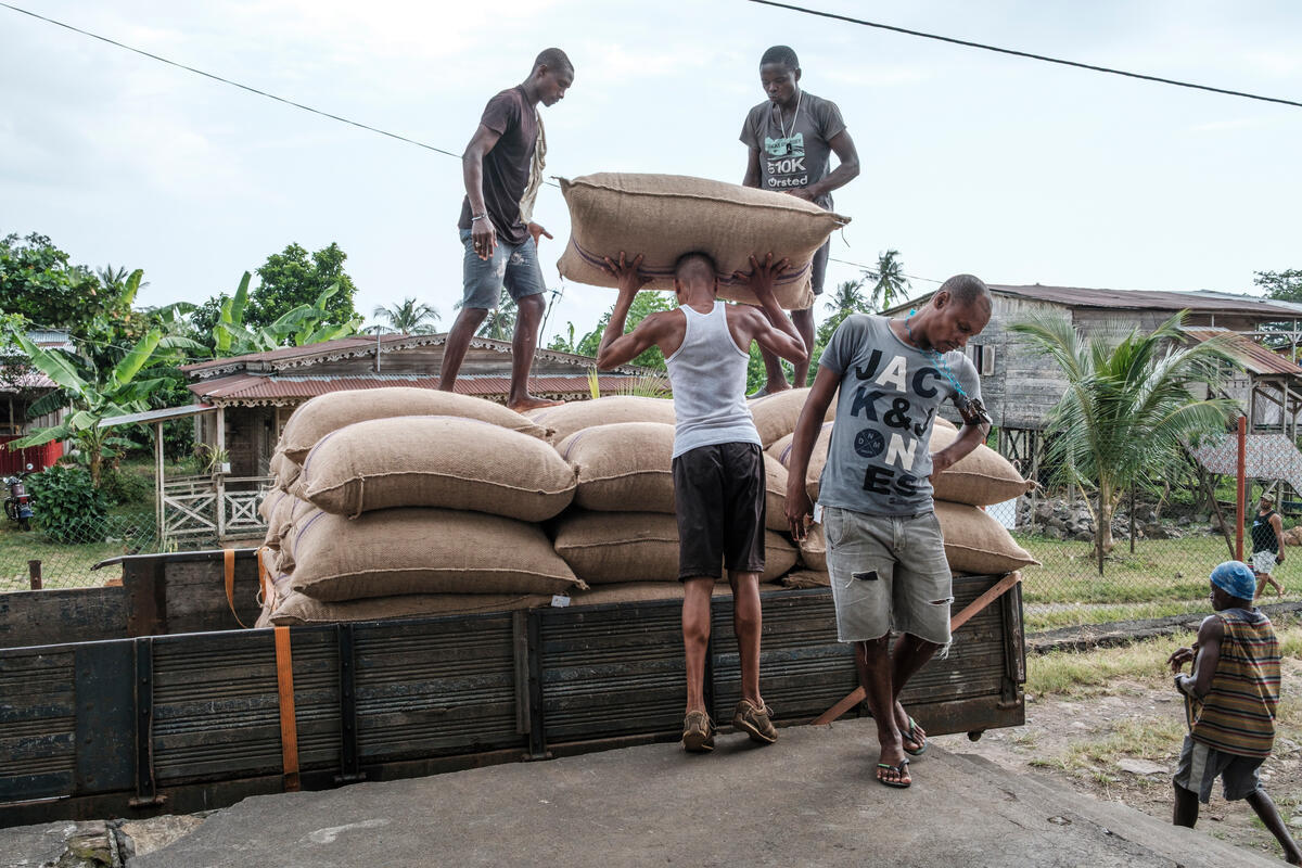 SAO TOME E PRINCIPE, 2025. Workers load sacks of cocoa beans