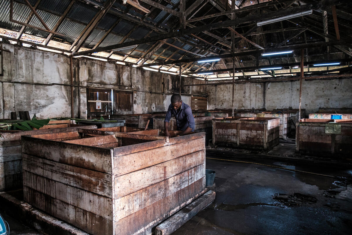 SAO TOME E PRINCIPE, 2025. Cocoa beans ferment in boxes