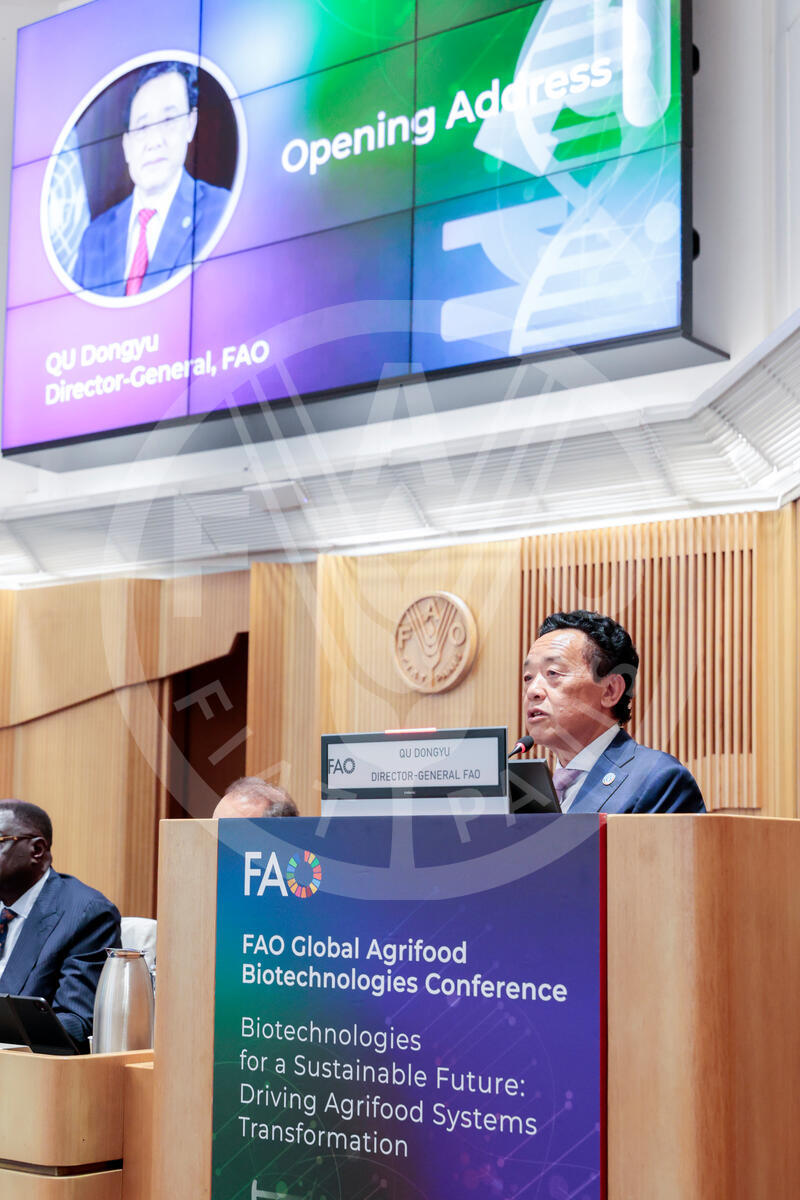 16 June 2025, Rome, Italy. FAO Director-General QU Dongyu delivers his opening address during the International Biotechnology Conference on “Biotechnologies for sustainable Future: Driving Agrifood Systems Transformation”. FAO headquarters (Red Room).