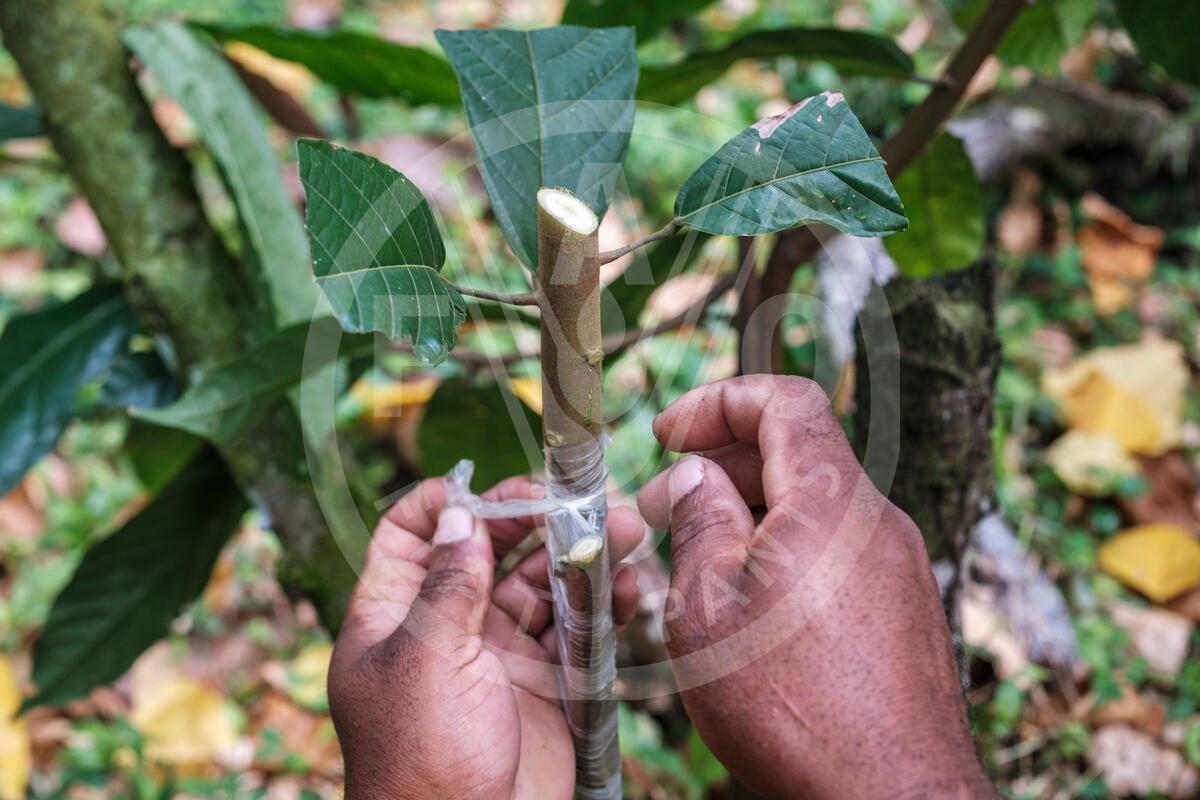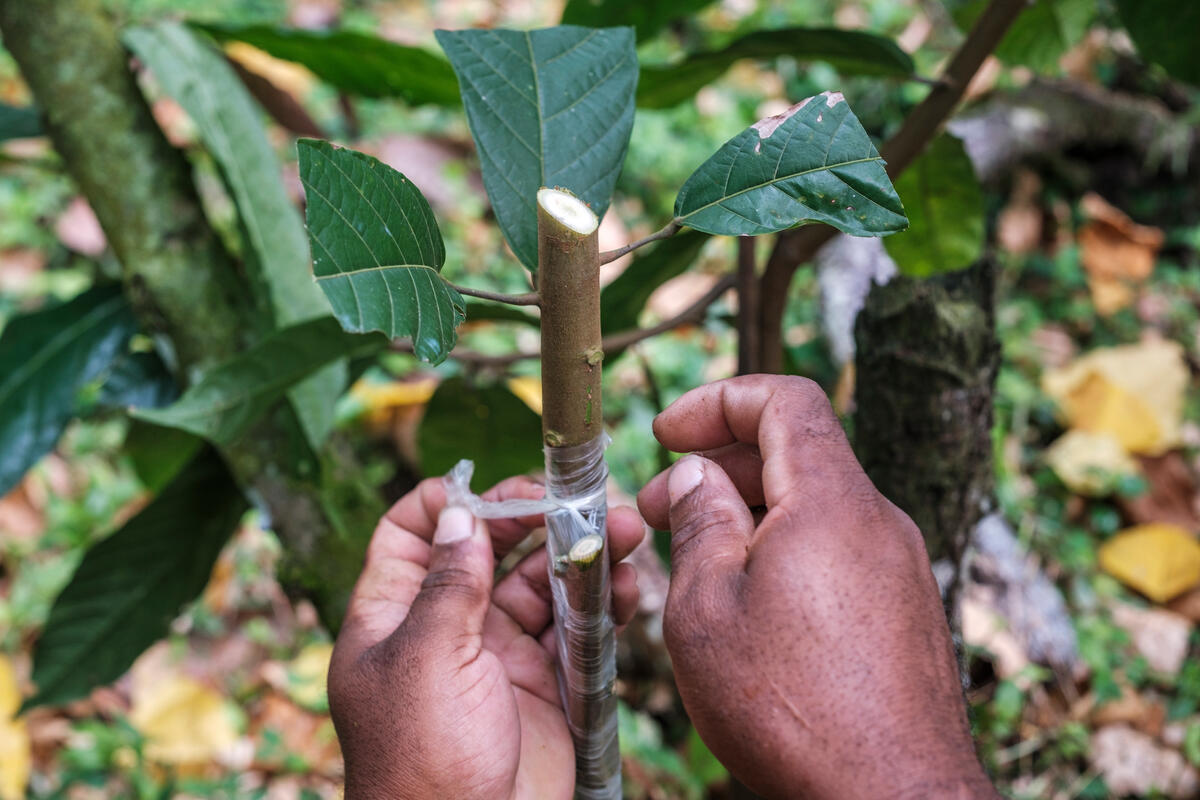 s02 June 2025. Queluz, Sao Tome e Principe. Dodamin Semedo Correia, farmer, performs a graft in one of his cocoa trees. The project “Landscape Restoration for Ecosystem Functionality and Climate Change Mitigation in the Republic of Sao Tome and Principe (STP)” is part of the framework programme of The Restoration Initiative (TRI) and is known by the acronym TRI-STP.