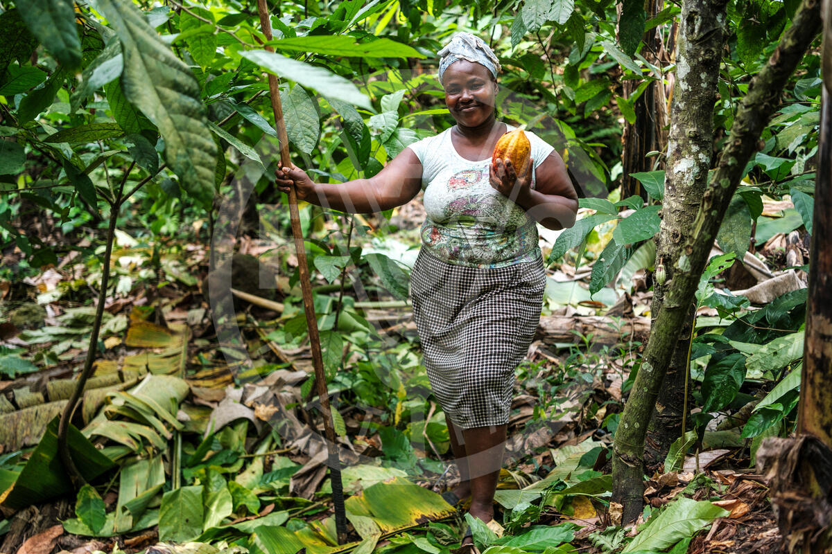 SAO TOME E PRINCIPE, 2025. Woman farmer with just-picked cocoa pods