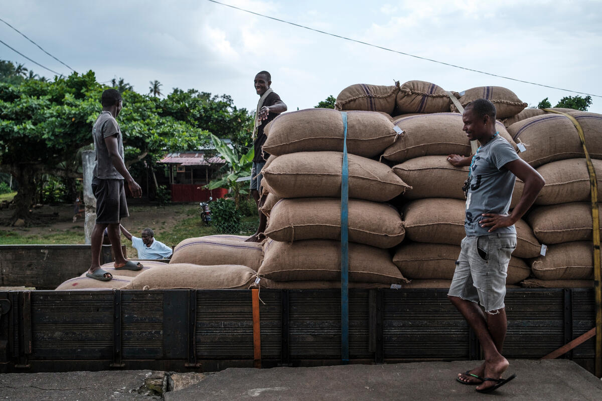 SAO TOME E PRINCIPE, 2025. Workers load sacks of cocoa beans