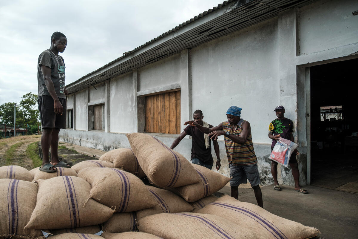 SAO TOME E PRINCIPE, 2025. Workers load sacks of cocoa beans