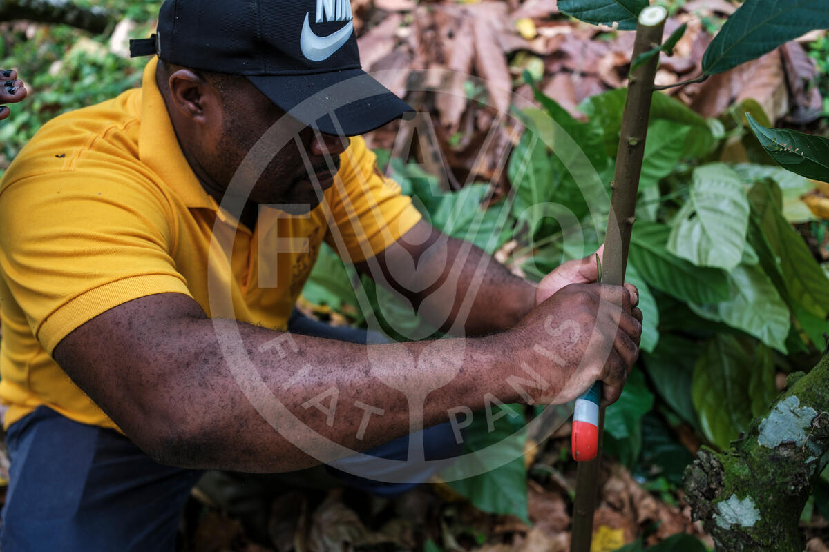 s02 June 2025. Queluz, Sao Tome e Principe. Dodamin Semedo Correia, farmer, performs a graft in one of his cocoa trees. The project “Landscape Restoration for Ecosystem Functionality and Climate Change Mitigation in the Republic of Sao Tome and Principe (STP)” is part of the framework programme of The Restoration Initiative (TRI) and is known by the acronym TRI-STP.