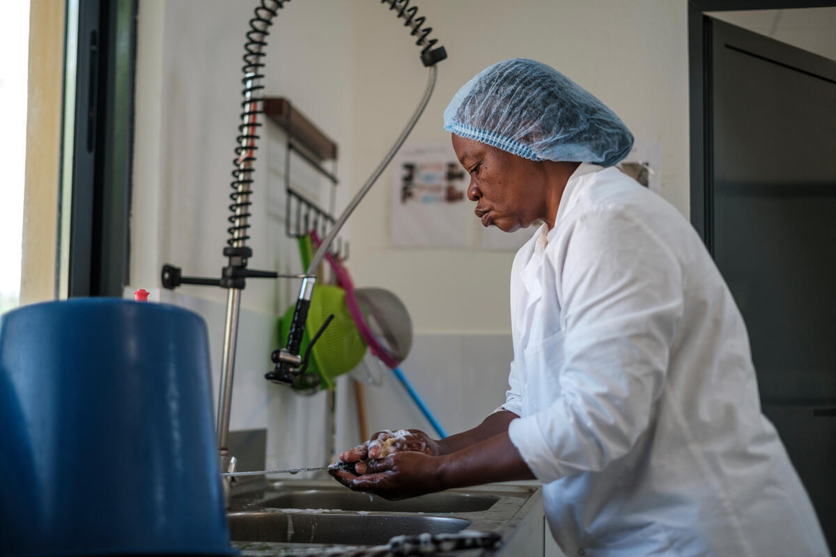 04 June 2025. Guadalupe, Sao Tome e Principe. Antonia dos Lantos Neto, manager, washes a tool at the chocolate factory of the Organic Cocoa Production and Export Cooperative (CECAB).