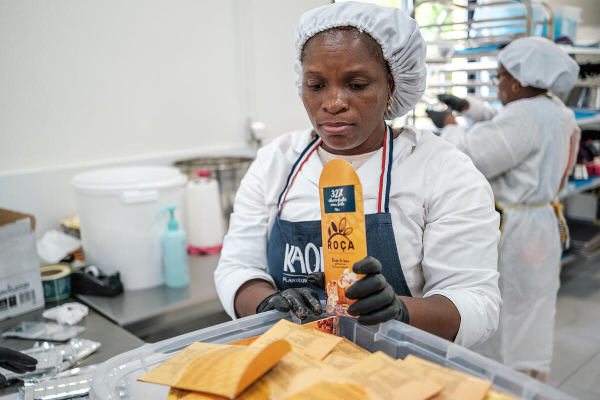 04 June 2025. Guadalupe, Sao Tome e Principe. A worker holds a chocolate bar already packed at the chocolate factory of the Organic Cocoa Production and Export Cooperative (CECAB).