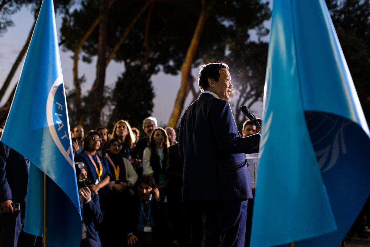 16 October 2025, Rome, Italy. FAO Director-General QU Dongyu delivers his address during the Illumination on the FAO façade and garden. FAO World Food Day Global ceremony and 80th Anniversary celebration. This year’s World Food Day coincides with FAO’s 80th anniversary, reflecting decades of work to boost food production, reduce poverty, and respond to crises. FAO Headquarters (FAO entrance).