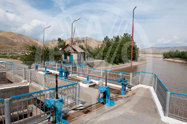 Kyrgyzstan, Jelal-Abad region. A primary irrigation channel with water distribution equipment built and installed by the World bank and FAO. Water is distributed to minor irrigation channels from here.