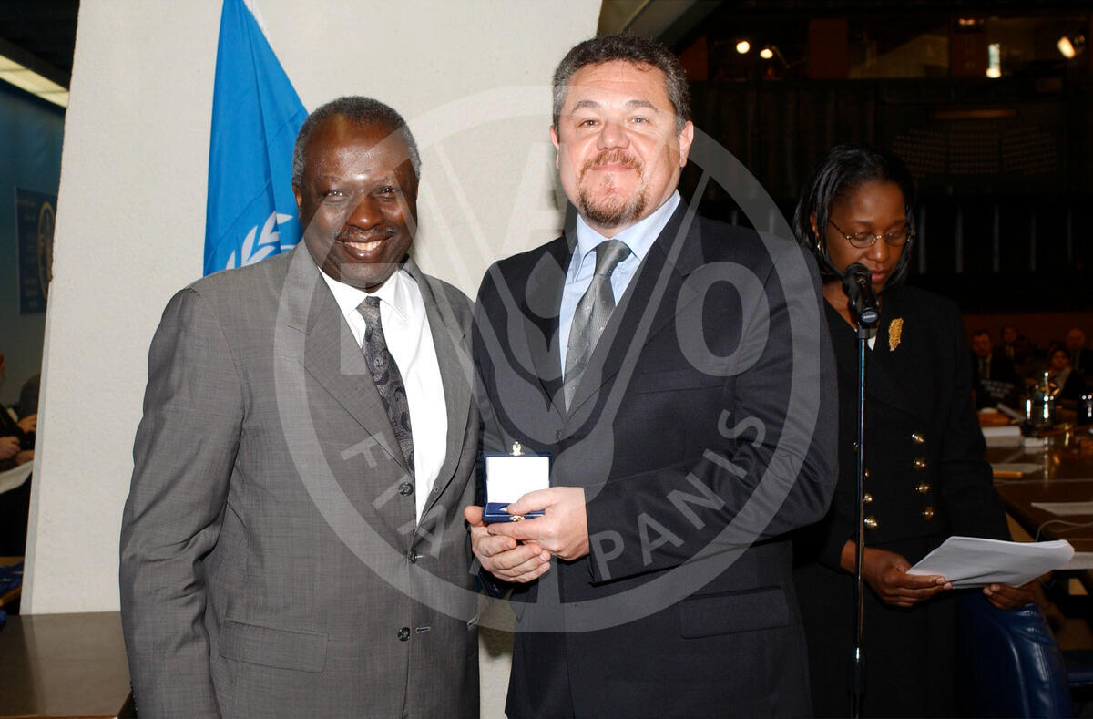25 October 2005, Rome - FAO Director-General Jacques Diouf presenting the 25-year seniority award to Mr. Martinez.