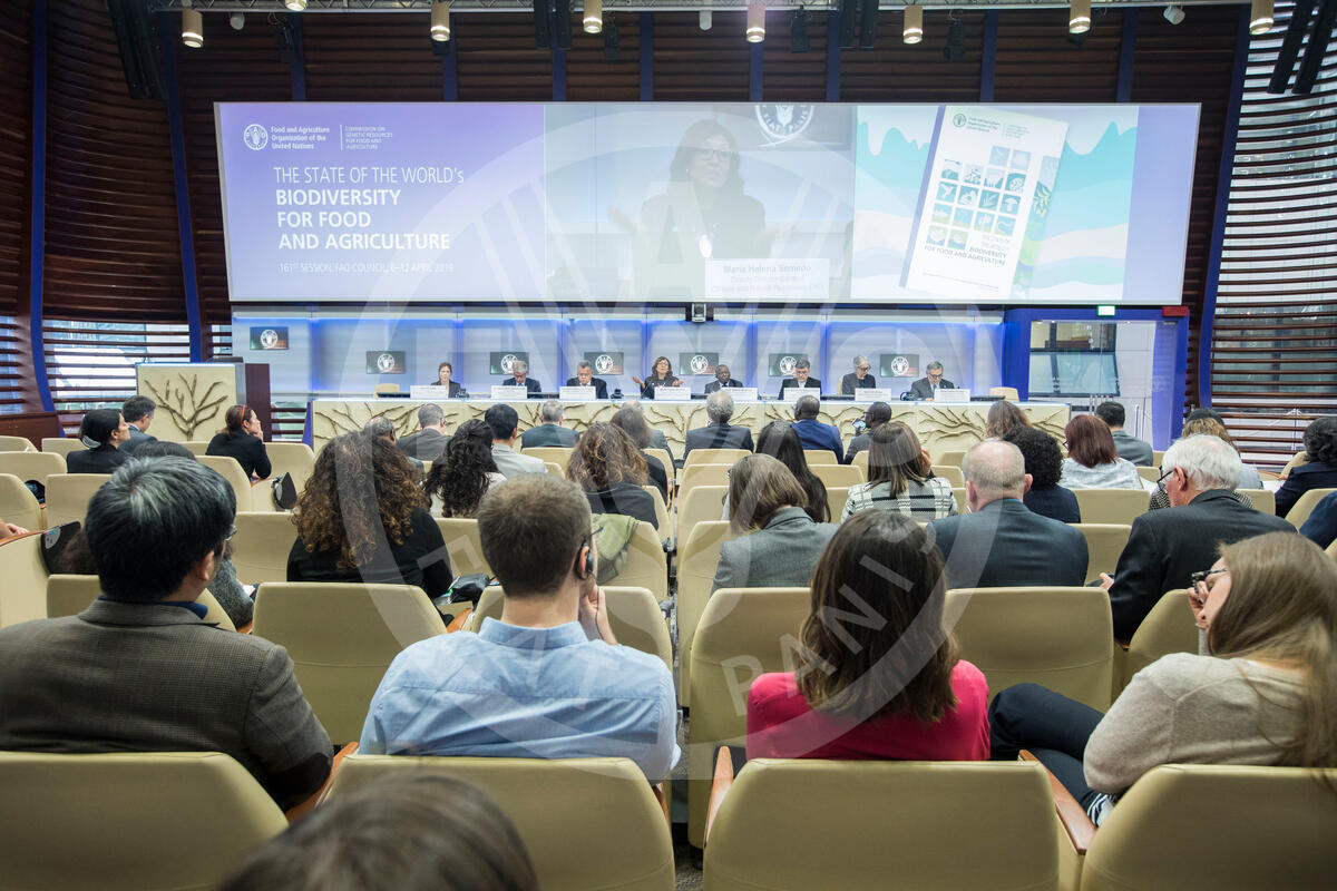 08 April 2019, Rome, Italy - (Left to right) Julie Belanger, Secretariat, Commission on Genetic Resources for Food and Agriculture (FAO), Alfonso Mari�Dastis Quecedo, Ambassador, Permanent Representative of Spain to FAO, Edward Francisco Centeno Gadea, Minister for Agriculture, Livestock and Forestry of Nicaragua, Maria Helena Semedo, Deputy Director-General, Climate and Natural Resources (FAO), Gabriel Mbairobe, Minister for Agriculture and Rural Development of Cameroon, Mohammad Hossein Emadi, Ambassador, Permanent Representative of the Islamic Republic of Iran to FAO, Gunnvor Berge, Deputy Permanent Representative of Norway to FAO, Rene Castro Salazar, Deputy Director-General. FAO. The Way Forward for Biodiversity for Food and Agriculture. FAO Headquarters (Sheikh Zayed Center).