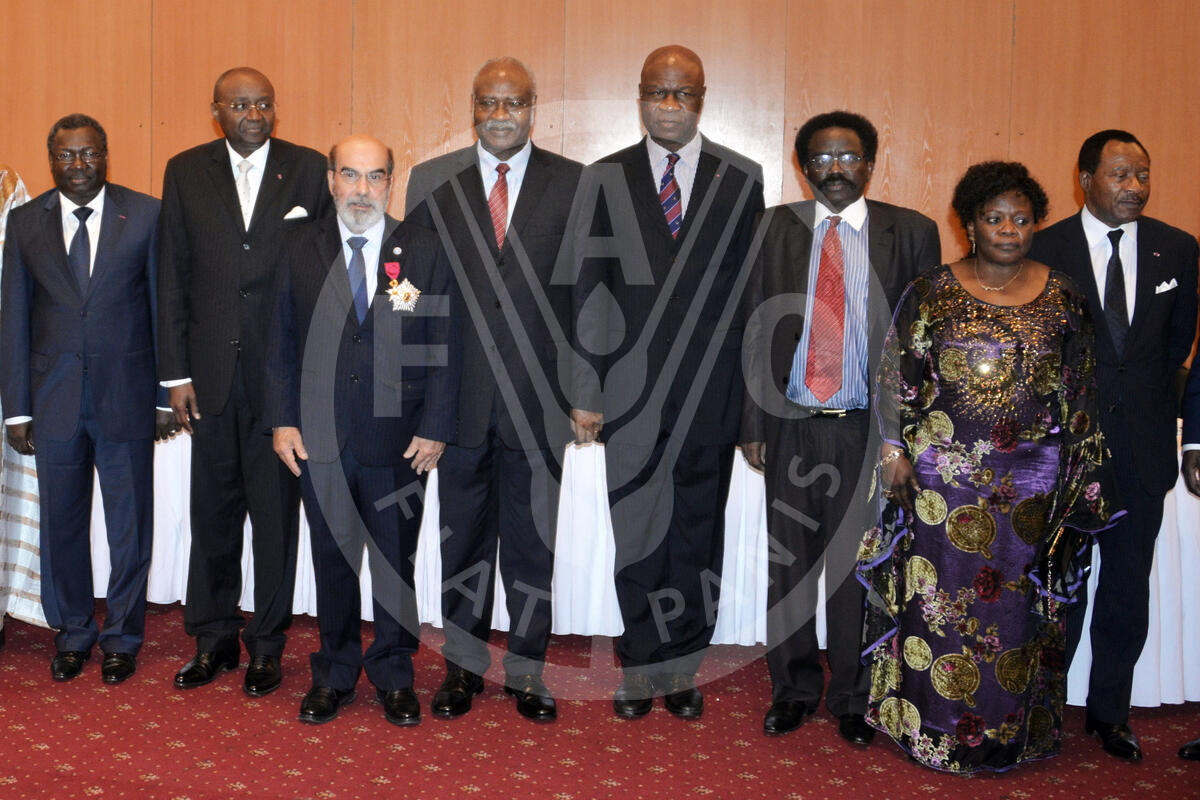 4 September 2015, Yaoundé, Cameroon - On behalf of the President of Cameroon Paul Biva, the Prime Minister of Cameroon Philémon Yang (4th from left) awards FAO Director-General José Graziano da Silva (3rd from left) with the medal of 'Grand Officier de l'Ordre de Valeur'/Grand Officer of the Order of Valour", an honorary distinction of the highest order in recognition of the role of Food and Agriculture Organization of the United Nations (FAO) and its Director-General for the development of agriculture in Cameroon.