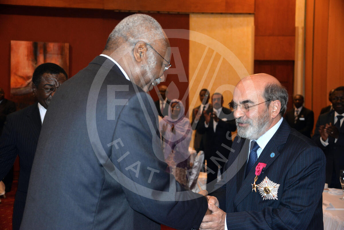 4 September 2015, Yaoundé, Cameroon - Prime Minister Philemon Yang congratulates FAO Director-General José Graziano da Silva following the conferment on behalf of the President of Cameroon Paul Biya an honorary distinction of the highest order in recognition of the role of Food and Agriculture Organization of the United Nations (FAO) and its Director-General for the development of agriculture in Cameroon.
