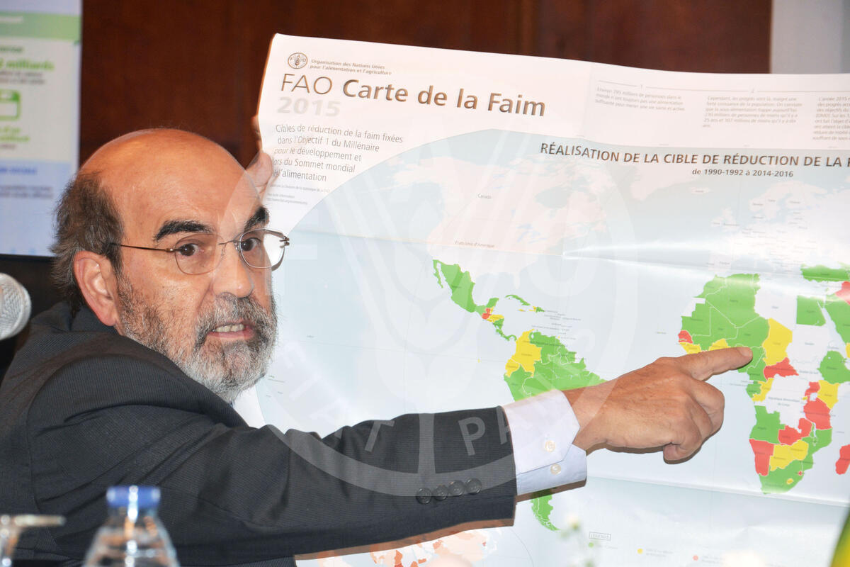 5 September 2015, Binguela, Cameroon - FAO Director-General José Graziano da Silva presents the FAO world hunger map at a press conference in Yaoundé, concluding an official three-day visit to Cameroon.