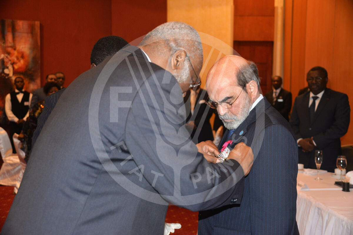 4 September 2015, Yaoundé, Cameroon - On behalf of the President of Cameroon Paul Biva, the Prime Minister of Cameroon Philémon Yang awards FAO Director-General José Graziano da Silva with the medal of 'Grand Officier de l'Ordre de Valeur'/Grand Officer of the Order of Valour", an honorary distinction of the highest order in recognition of the role of Food and Agriculture Organization of the United Nations (FAO) and its Director-General for the development of agriculture in Cameroon.