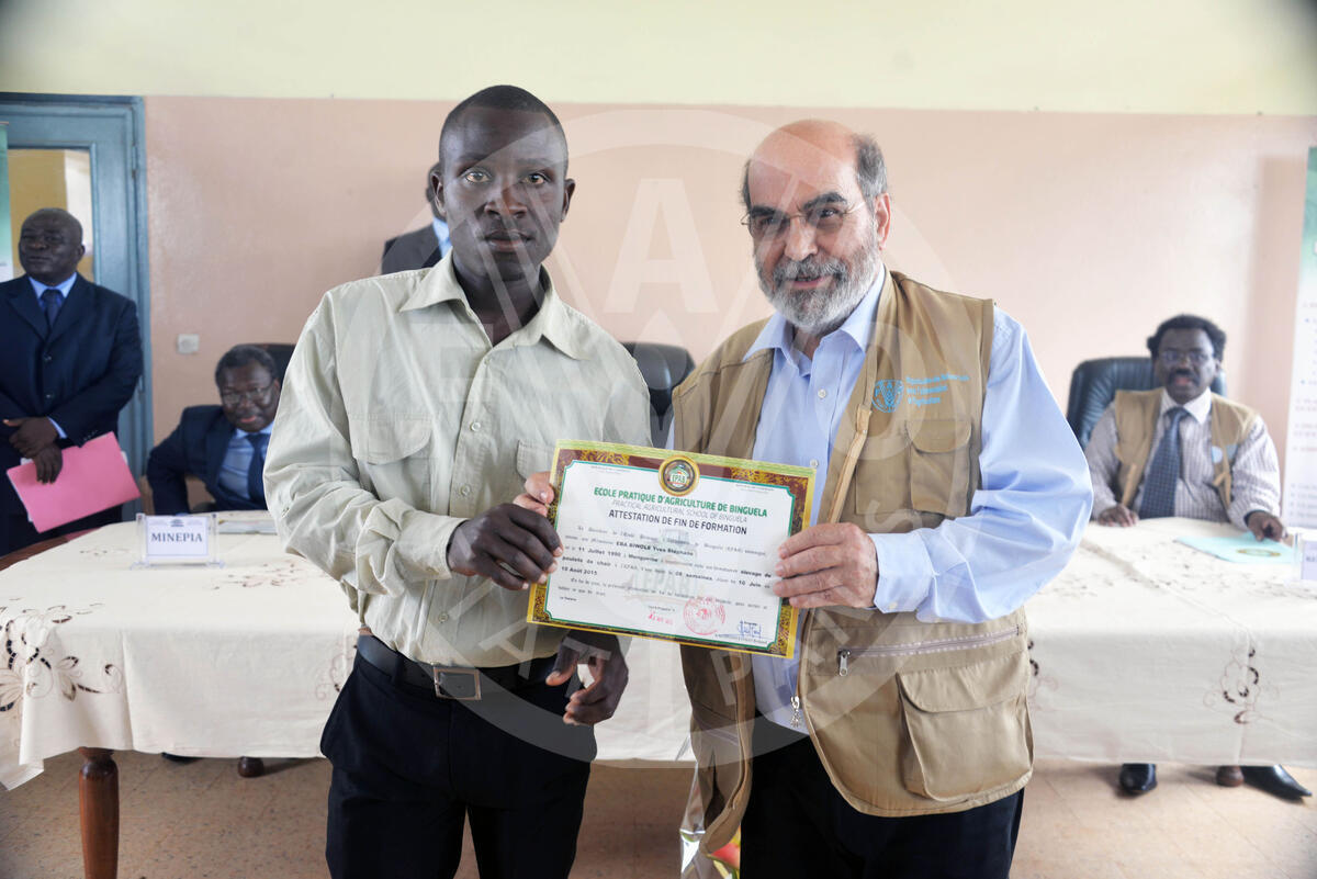 5 September 2015, Binguela, Cameroon - FAO Director-General José Graziano da Silva presents a student with a diploma for successful attendance at the agriculture training centre of Binguela, a township 32 km south west of Yaoundé, the capital. This center trains youth in agro- pastoral techniques, as well as opportunities to management and entrepreneurship in agribusiness.