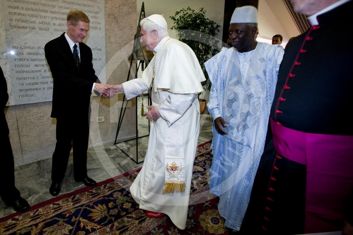 16 November 2009, Rome - His Holiness Pope Benedict XVI greeting FAO staff upon his arrival to FAO on the occasion of the World Summit on Food Security 16-18 November 2009, FAO Headquarters.