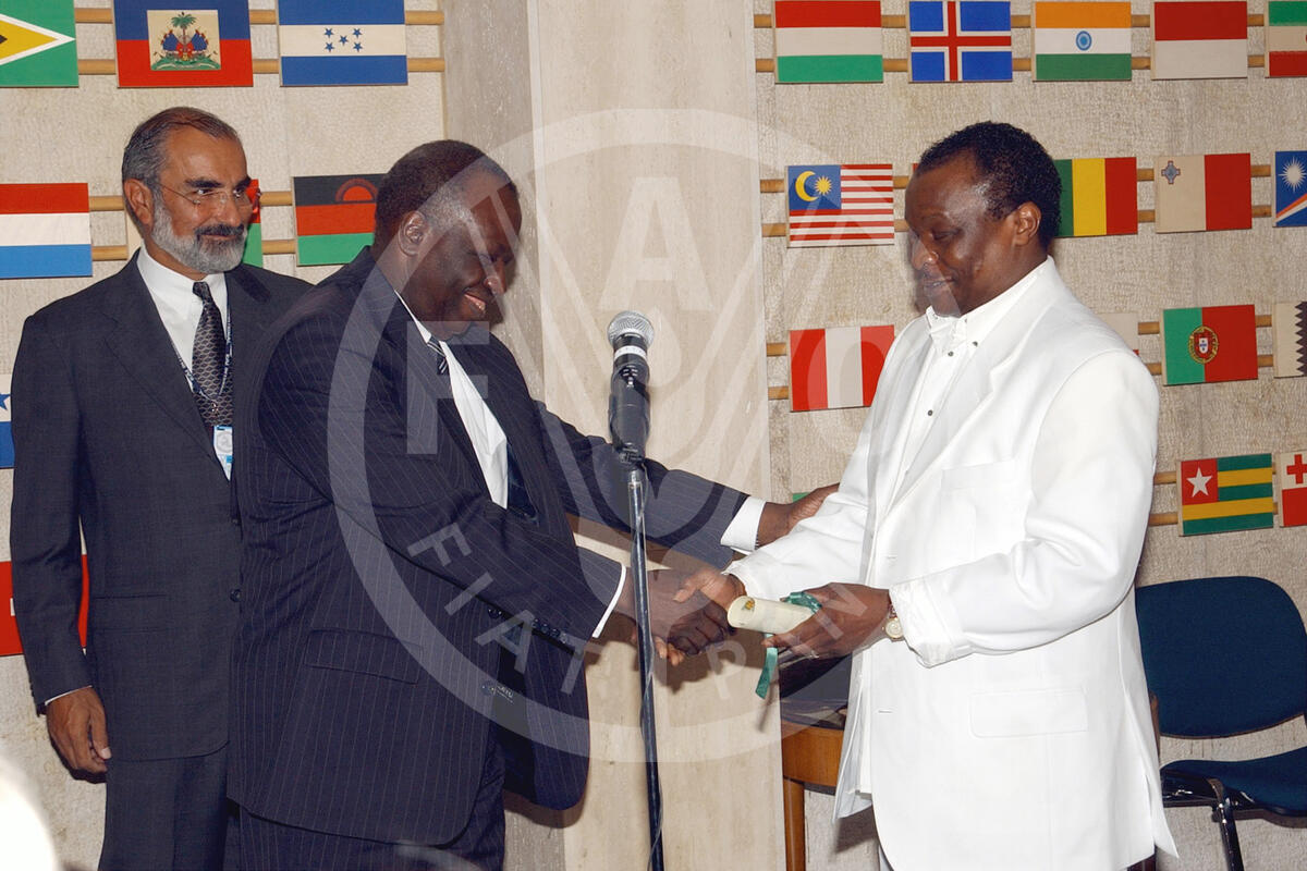 16 October 2001, Rome - FAO Director-General Jacques Diouf (L)nominating singer from Guinea Mory Kante as FAO Goodwill Ambassador at FAO Headquarters.