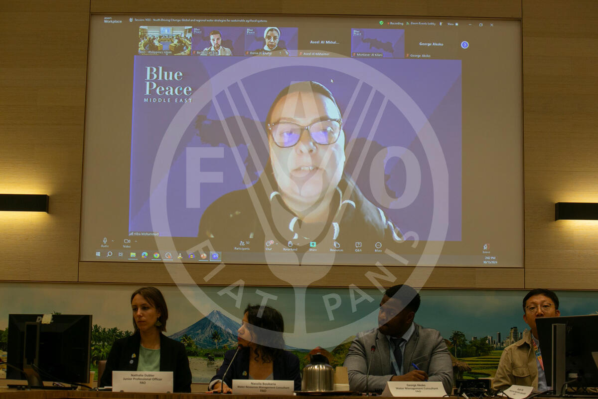 15 October 2024. Philippines Room, FAO Headquarters, Rome, Italy. Hiba Mohamad, Blue Peace Middle East Youth Ambassador, PhD candidate and coordinator of Mediterranean Task Force, speaks as a panelist during the WFF side event on global and regional water strategies for sustainable agrifood systems.