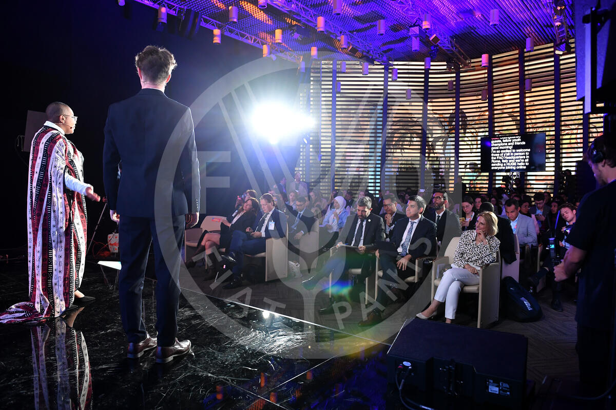 15 October 2024.Sheikh Zayed Centre (Atrium), FAO Headquarters, Rome, Italy. Moderators Ose Ehjaneta Arheghan and David Giles at the World Food Forum event, From Policy to Action: Youth shaping global agri-food systems.