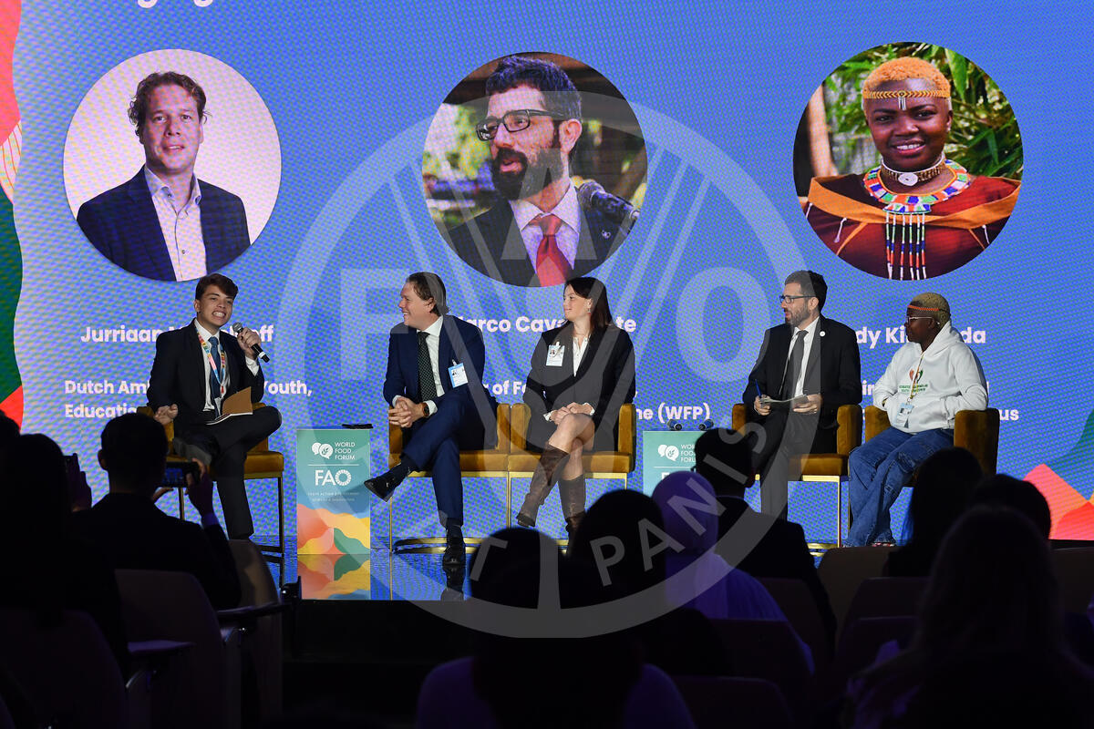 15 October 2024. Rome, Italy. View of panelists at the World Food Forum event, From Policy to Action: Youth shaping global agri-food systems.