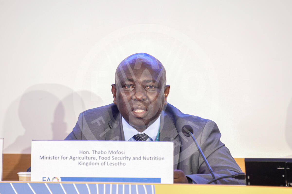 15 October 2024. Austria Room, FAO Headquarters, Rome, Italy. Thabo Mofosi, Minister for Agriculture, Food Security and Nutrition of the Kingdom of Lesotho, talks at the World Food Forum Southern Africa presentations of the Hand-in-Hand Regional Initiatives investment plans in the Austria Room. The Hand-in-Hand initiative aims at facilitating partnerships and investments to accelerate the transformation of agrifood systems in the region. In Southern Africa, the initiative targets regions with high rates of poverty and untapped potential for commercially oriented value chain development, as well as different commodities and value chains such as grains, poultry, fisheries, micro-irrigation, mechanization, among others.