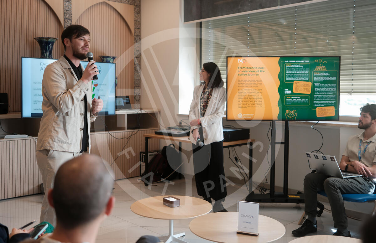 15 October 2024. Uzbekistan Lounge, FAO Headquarters, Rome, Italy. Founder of “Peacocks Coffee”, Matteo Pavoni, presents new innovative processing methods, as well as the flavor and taste profiles of different species and varieties of coffee.
