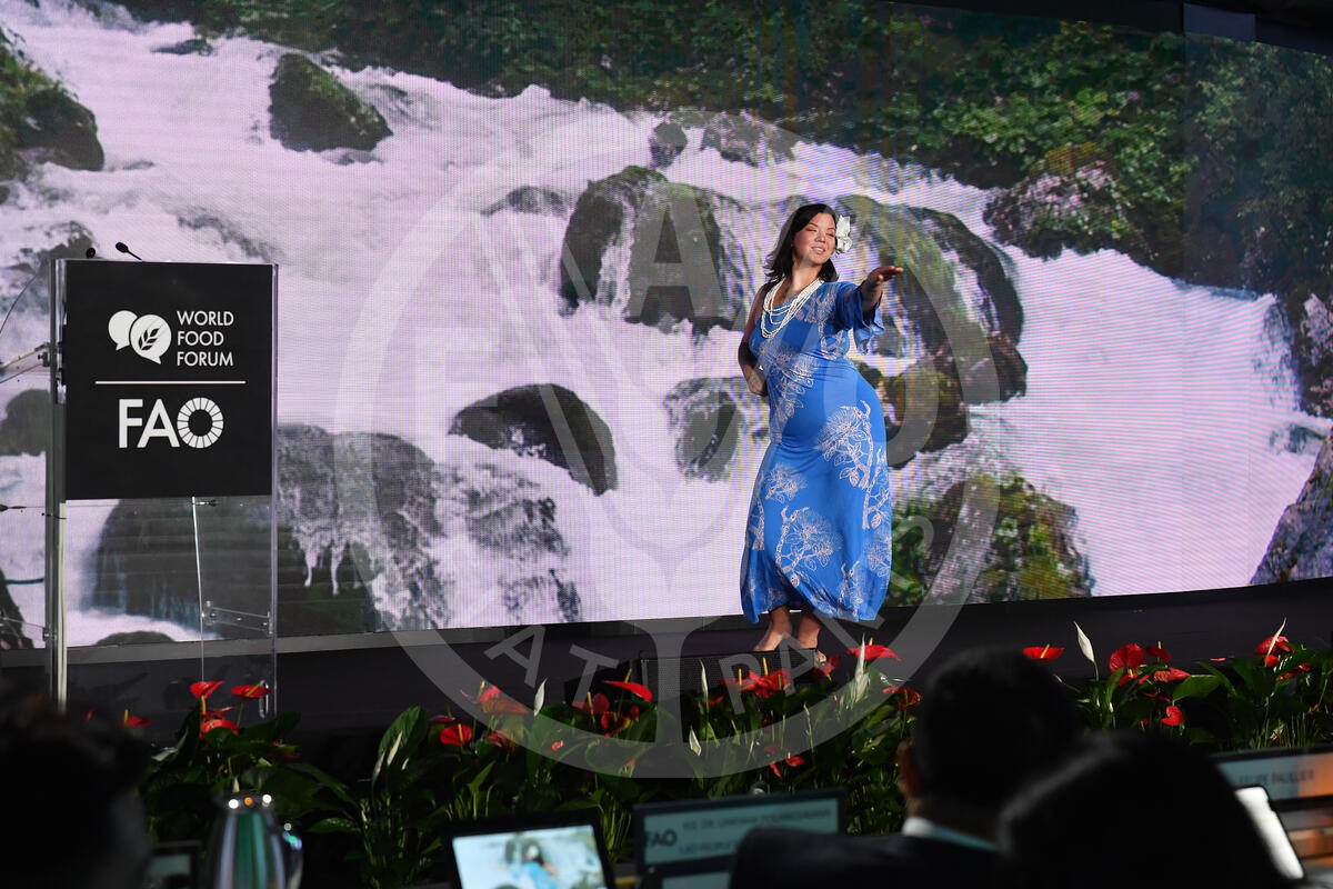 14 October 2024. Plenary Hall, FAO Headquarters, Rome, Italy. Pumehana performs a traditional dance from Hawaii at the World Food Forum Youth Assembly Opening Ceremony.
