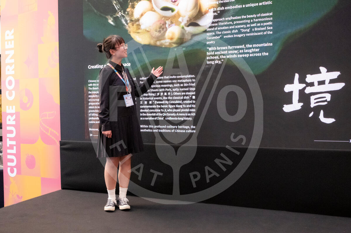 14 October 2024. Culture Corner, Atrium, FAO Headquarters, Rome, Italy. A representative of the Good Food Fund explains the mission of the association, which focuses on creating innovative and sustainable recipes.