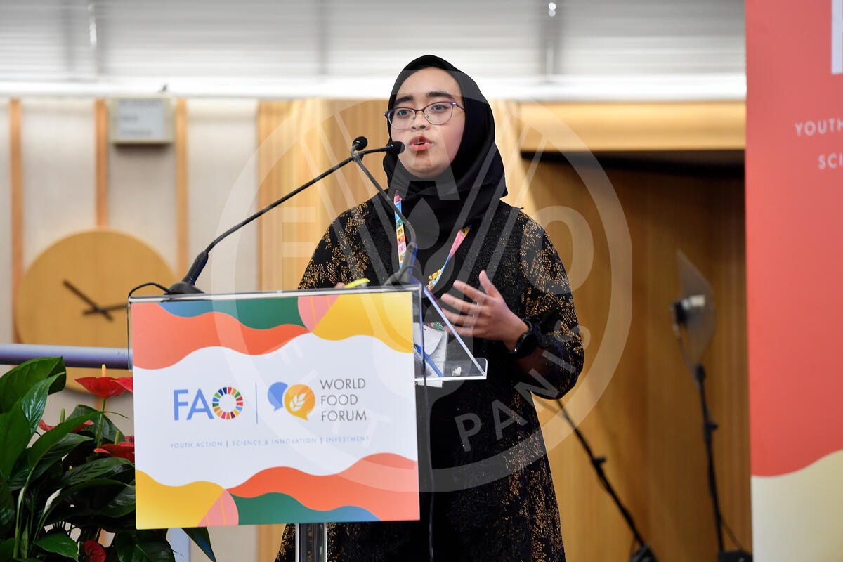 17 October 2024. Red Room, FAO Headquarters, Rome, Italy. Isnawati Hidayah, World Food Forum Young Scientists Group, gives her speech at the Joint SIF & Youth Forum: EmPOWERing Youth through innovative sustainable mechanization and digitalization.