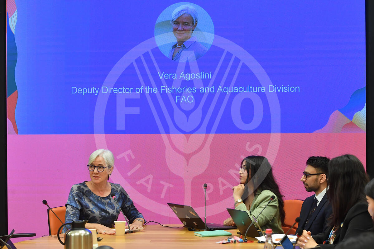 17 October 2024. Ethiopia Room, FAO Headquarters, Rome, Italy. Vera Agostini, Deputy Director of the Fisheries and Aquaculture Division (FAO), gives her speech at Aquatic Food System ( Thematic Youth Assembly Session).