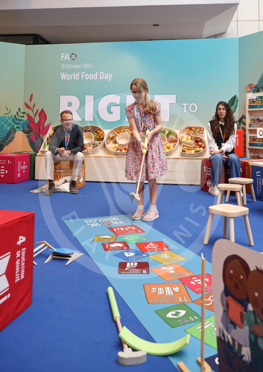 17 October 2024. Junior World Food Day Corner, Atrium, FAO Headquarters, Rome, Italy. World Food Forum attendees enjoying the Atrium exhibitions.