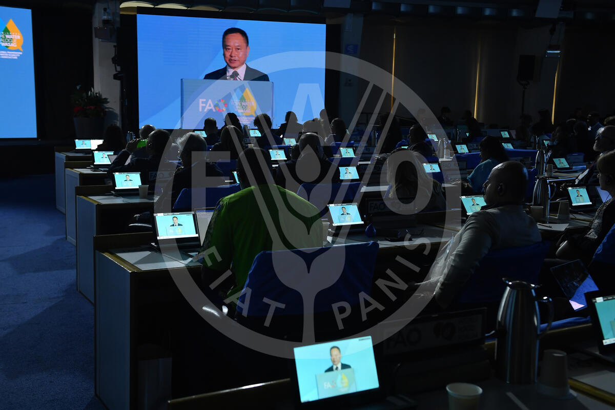 17 October 2024. Plenary Hall, FAO Headquarters, Rome, Italy. H.E. Li Guoying, Minister, Water Resources, China, gives his speech at High-Level Rome Water Dialogue on WASAG – the Global Framework on Water Scarcity in Agriculture.