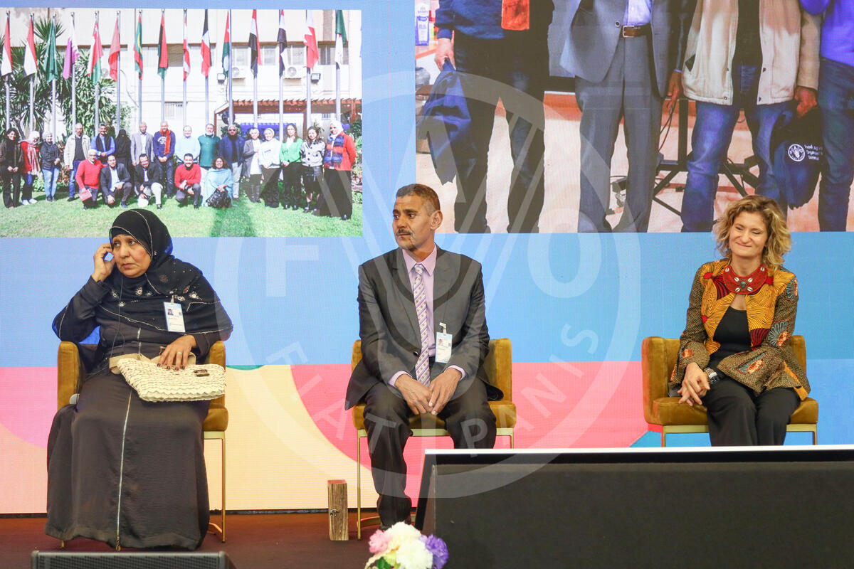 17 October 2024. Green Room, FAO Headquarters, Rome, Italy. View of panelists and Farmer Field Schools Innovation Award winner at the World Food Forum’s Celebrating local innovations to support transitions to sustainable agri-food systems.