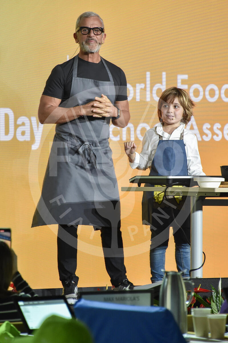 17 October 2024. Plenary Hall, FAO Headquarters, Rome, Italy. Chef, TV host and FAO Food Hero Max Mariola, with his son Mario, at the Global School Assembly and Junior World Food Day.